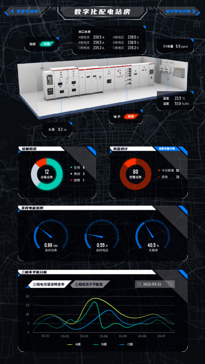 實(shí)現(xiàn)數(shù)字化配電房的可視化呈現(xiàn),將實(shí)驗(yàn)室展板的配電房設(shè)備拓?fù)湟匀S的方式呈現(xiàn)。