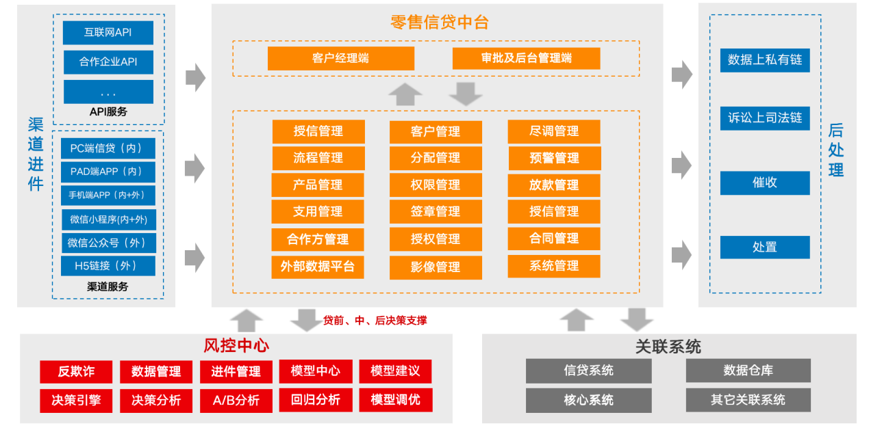 平臺與行內(nèi)系統(tǒng)對接,以全新的技術(shù)平臺為底座,搭建客戶平臺、行內(nèi)人員平臺、后臺管理平臺、風(fēng)控系統(tǒng)四套子系統(tǒng),支持在線上平臺完成貸款從申請、受理、授信、審批、用款、還款、貸后的完整流程,具備線上貸款業(yè)務(wù)閉環(huán)管理的特點。