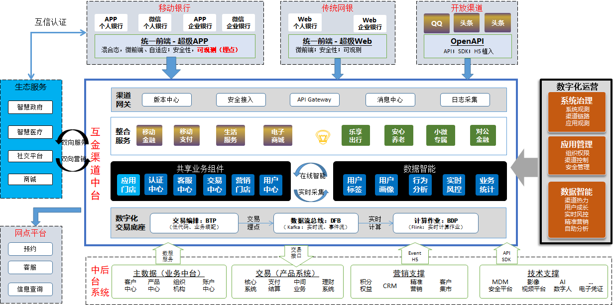 銀行互聯網渠道的協同與服務平臺,集成業務中臺和數據中臺為樞紐的能力中心。